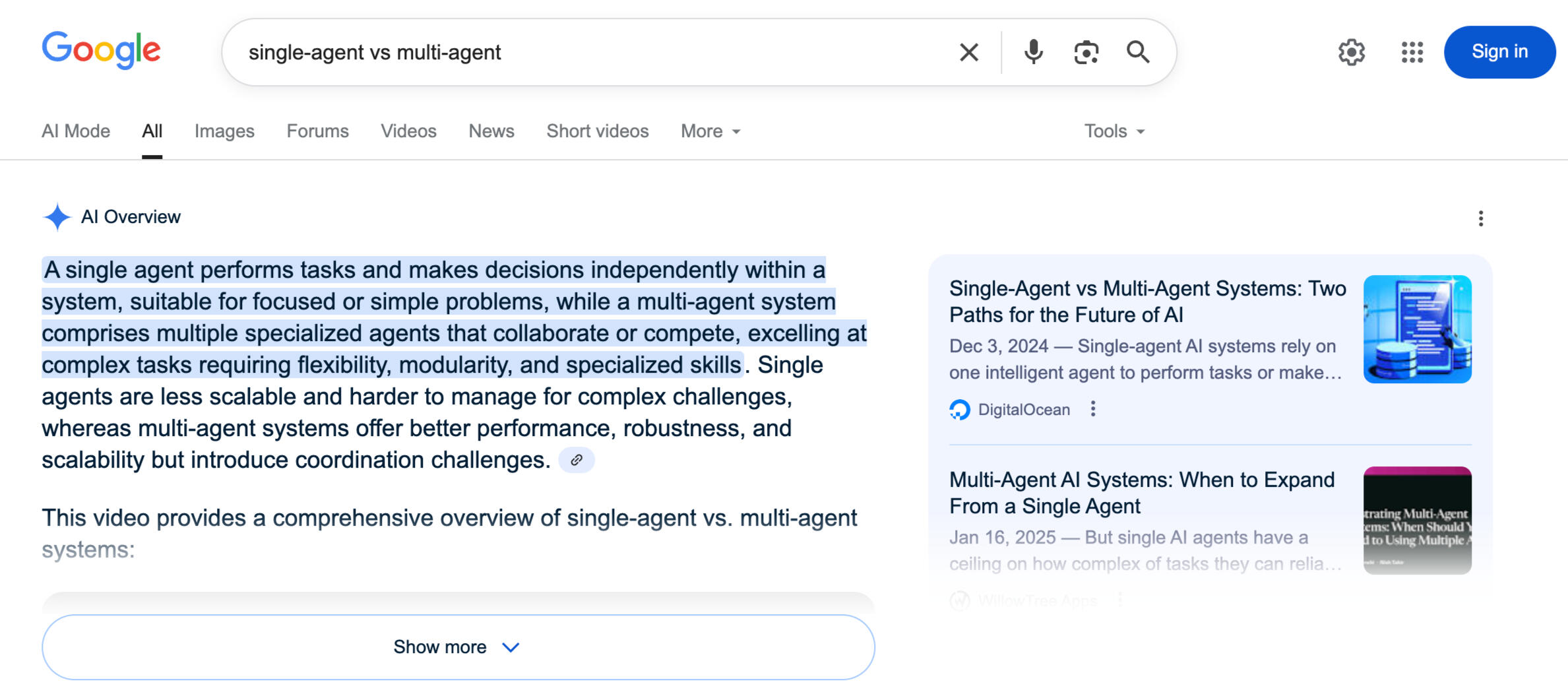 SEO remains a powerful traffic driver and, more often than not, SEO and AEO goals align: Accurate, authoritative, well-researched content on brand-relevant keywords and topics still drives traffic. I provide content that balances search intent, technical accuracy, and brand-building narratives that influence LLM outputs.Example: Single-Agent vs Multi-Agent Systems: Two Paths for the Future of AI for Digital Ocean.Check out my SEO/AEO content here.